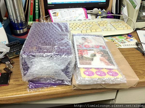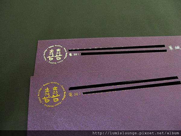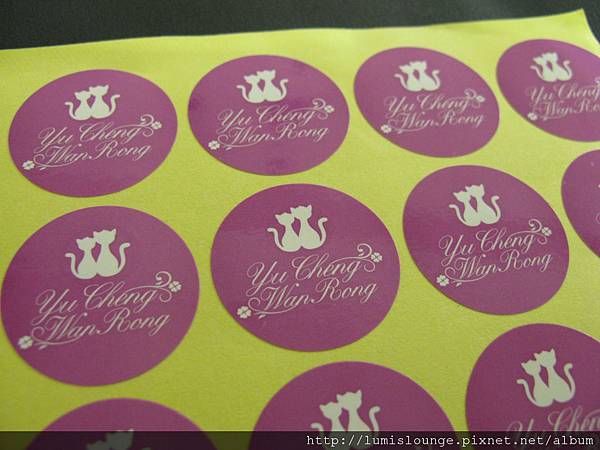 ↓ 貼紙的色差跟校稿時有差,校稿時我以為是淡紫色,結果實品比較像是紫紅色,但對我來說還可以接受。而且廠商多寄了一些,還可以拿來貼在婚禮小物上,呵呵。