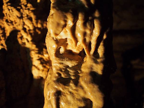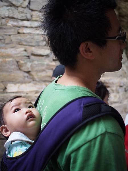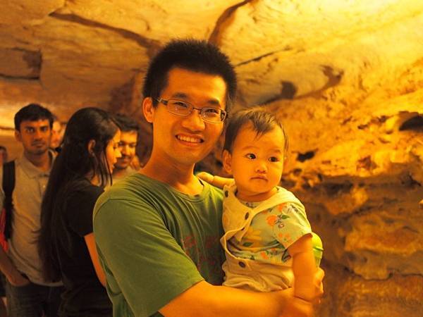 因為洞穴裡面形成鐘乳石的作用還是持續進行中 地面會濕滑 有時還會被水滴到 為了保險起見 我們用背帶背著Elvia走